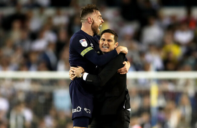 Richard Keogh and manager Frank Lampard celebrate after tonight's game. Tim Goode