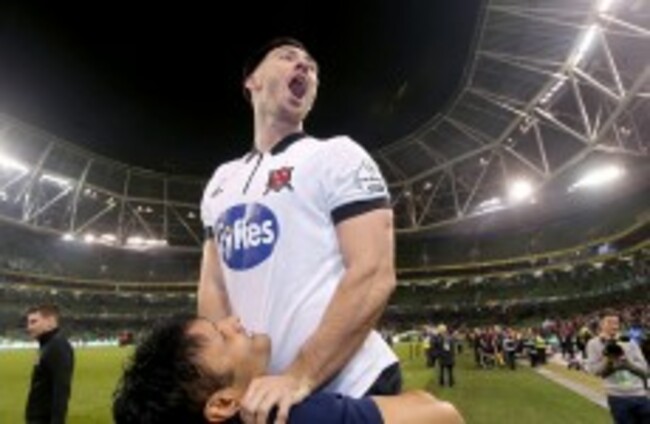 Dundalk goalkeeper Gary Rogers celebrates with his 15 month old daughter Bonnie. Ryan Byrne / INPHO