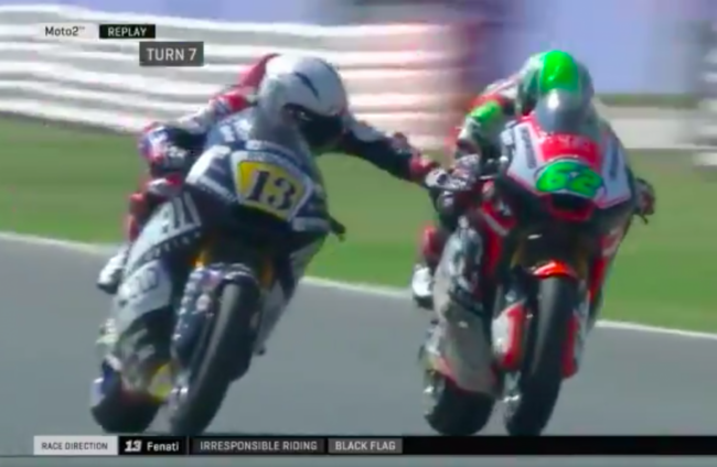 Moto2 rider Romano Fenati was given a black flag for attempting to grab the front brake of rival Stefano Manzi.