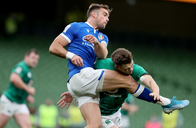 Ringrose catches Edoardo Padovani's knee in the face while attempting a chargedown. Dan Sheridan/INPHO