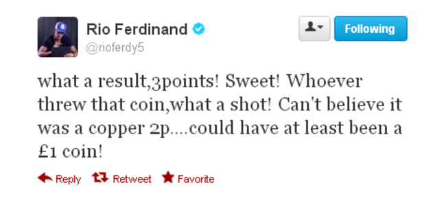 Ferdinand is hit by a coin. Credit: Martin Rickett/PA Wire/Press Association Images