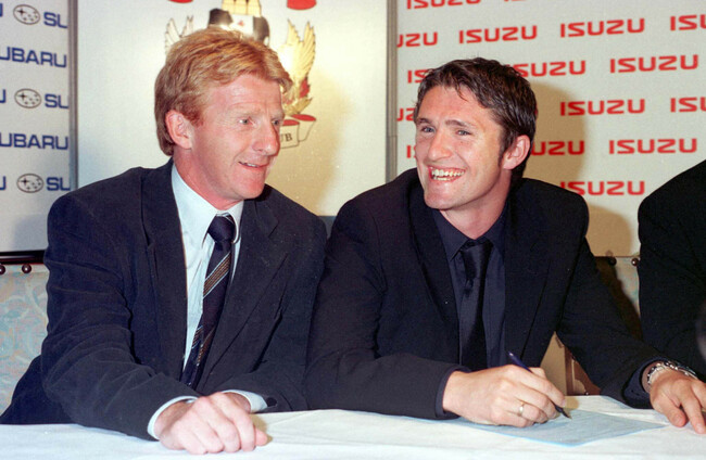 Coventry City boss Gordon Strachan (left) with Robbie Keane at his unveiling in August 1999. PA