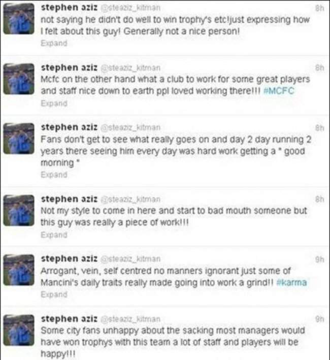 Stephen Aziz, who now works for Sunderland, lambasted Mancini in a series of tweets, saying: “Arrogant, vain, self-centred no manners ignorant just some of the daily traits really made going into work a daily grind!! #karma”.”
