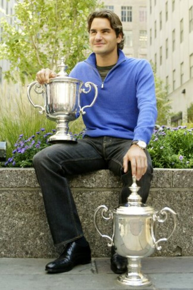 Posing with two of his US Open titles in 2005. (AP Photo/Adam Rountree)