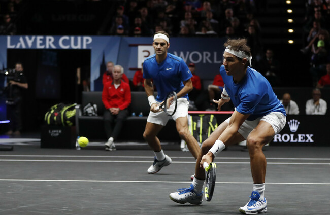 ROGER FEDERER AND Rafael Nadal came together as a doubles pair for the first time to help Europe into a 9-3 lead over the World team on the second day of the Laver Cup in Prague.