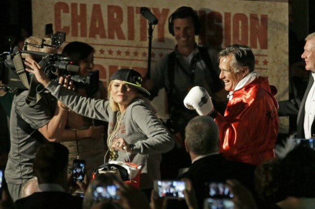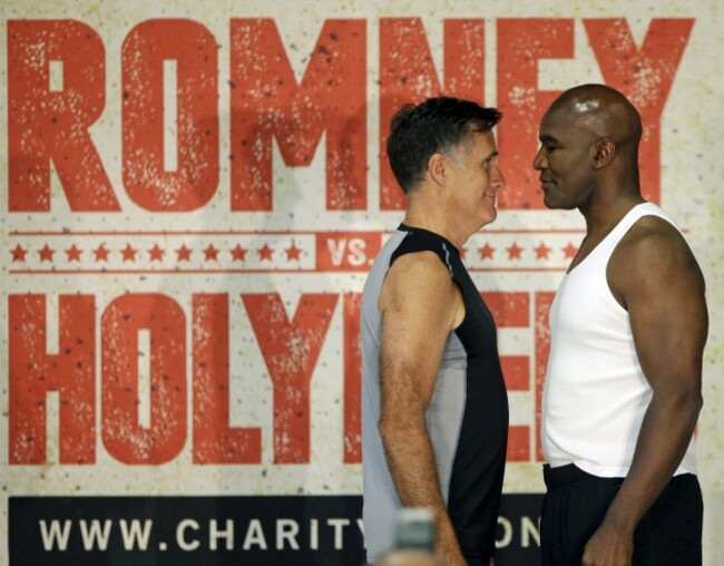 FORMER WORLD BOXING champion Evander Holyfield used ex-US presidential candidate Mitt Romney as a punching bag for two rounds on Friday — all in the name of good fun and charity.