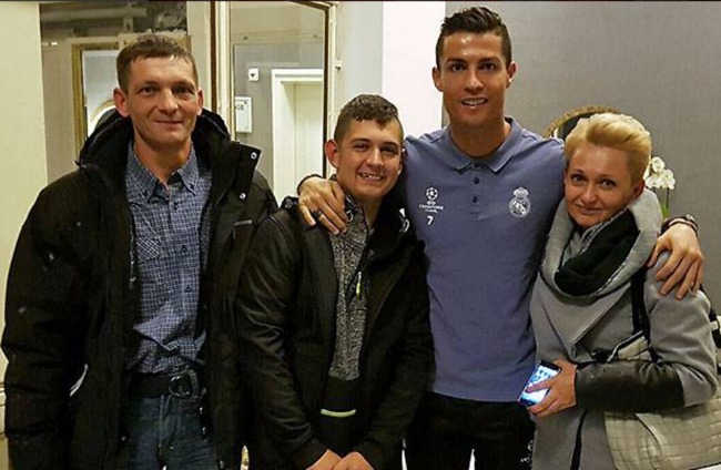 REAL MADRID STAR Cristiano Ronaldo enjoyed an emotional reunion with Polish fan David Pawlaczyc at the team’s Warsaw hotel today.