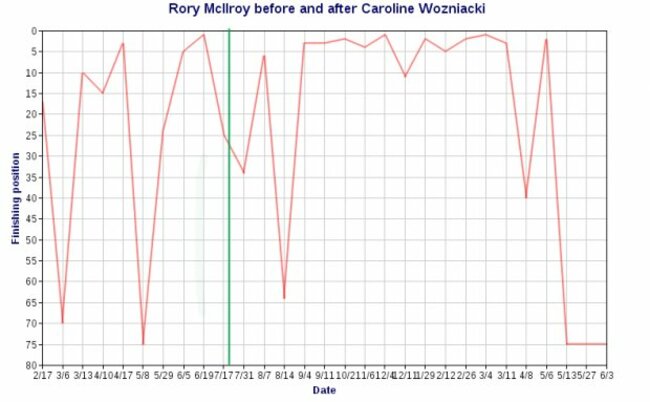 We’ve extensively crunched the numbers involving the pre- and post-relationship performances of both players. While McIlroy initially rose to #1 in the world after they started dating, they’ve both taken a nose-dive in recent months.