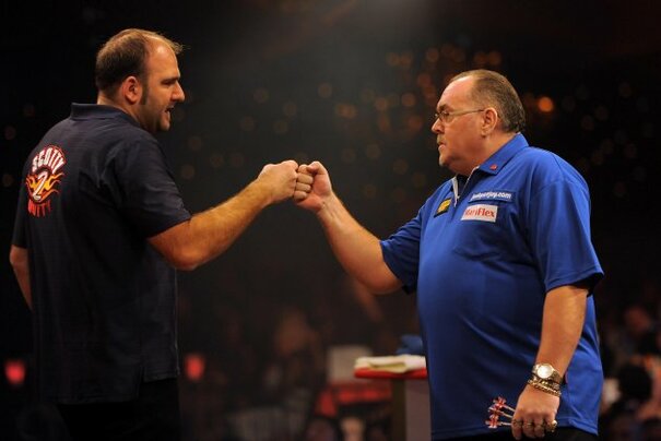 England's Tony O'Shea (right) punches the hand of England's Scott Waites before during the BDO World Professional Darts Championships at the Lakeside Complex