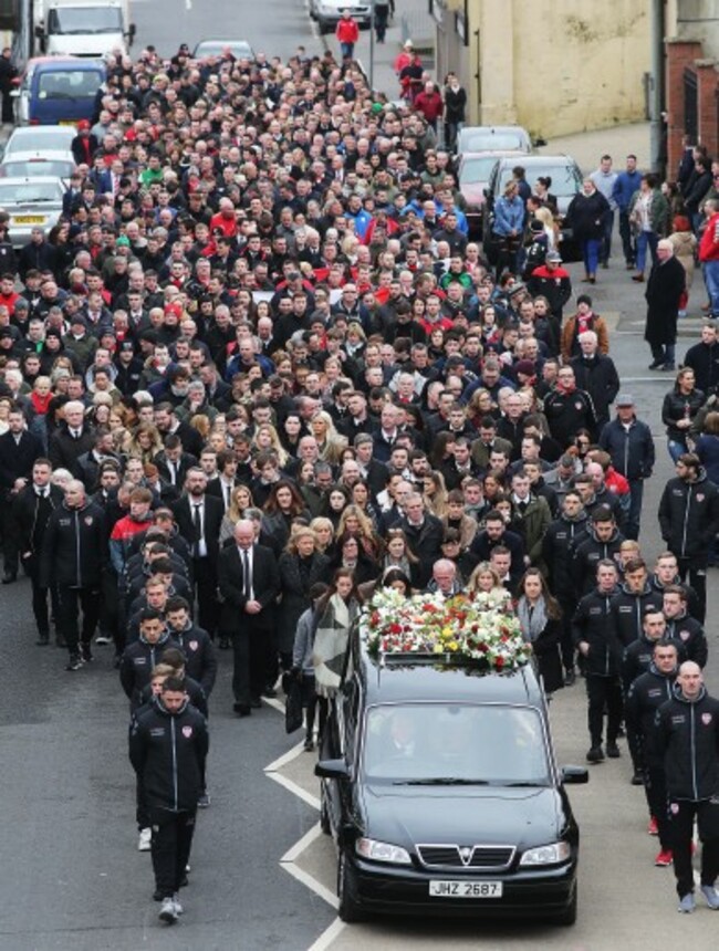“We think of him as an athlete on his prime, who achieved much and still had great potential, a versatile and accomplished footballer, of the thrilling moments he brought to so many supporters of Derry City, and across Ireland, over the past seven years,” said Father Aidan Mullan.