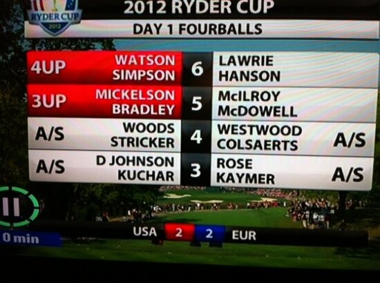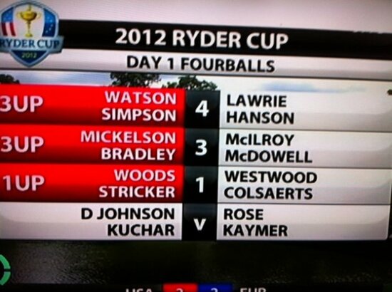 Watson/Simpson v Lawrie/Hanson – US three up after four: the shouts of U-S-A, U-S-A are coming from all over the course and Europe have no answer to the American charge at the moment. I believe it’s what they call ‘Big Mo’ in presidential elections. Coach Love’s got it right now.