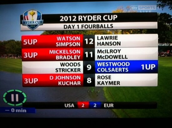 As President Van Rompuy might want it – the rallying call for Europe echoes out from Brussels. New boy Colsaerts knocks in a 25-footer, baby, for birdie at two earning a half that will rightly rankle with the Americans. They should be two-holes up there.