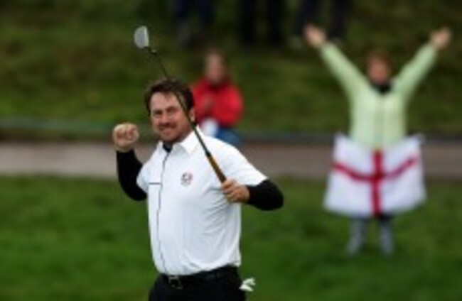 Edoardo Molinari leads Rickie Fowler by 3 with 4 to play, and looks set to secure the 14th European point, but elsewhere Phil Mickelson and Zach Johnson appear set to narrow the deficit for the reigning champions. Mickelson is dominating Peter Hanson, being 3 up after 13. Meanwhile, Johnson is running rampant over a once-again out-of-sorts Padraig Harrington.