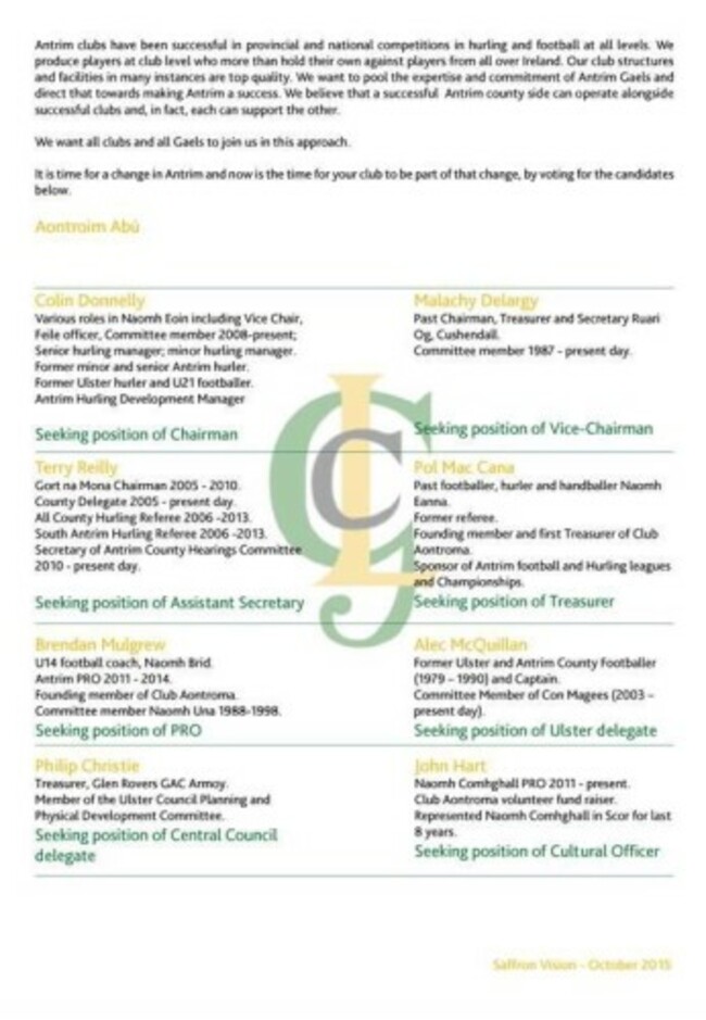 Other Saffron Vision members are seeking the assistant secretary, Treasurer, PRO, Ulster delegate, Central Council delegate and Cultural Officer roles in Antrim GAA.