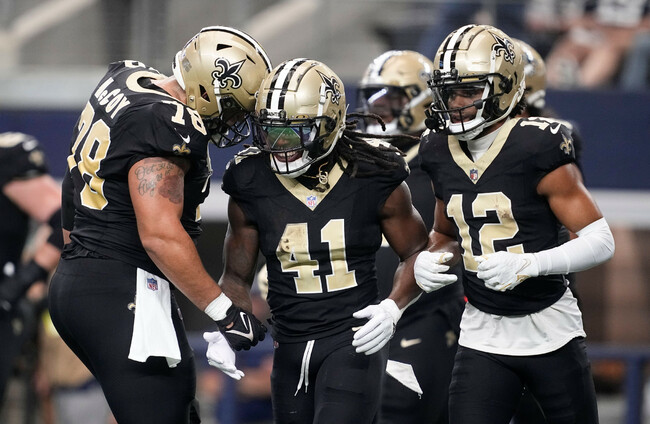 New Orleans Saints running back Alvin Kamara (41) reacts with teammates Erik McCoy (78) and Chris Olave (12) after scoring on a touchdown. Alamy Stock Photo