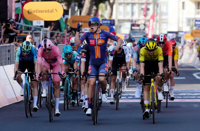 Olav Kooij of Visma was second and Maikel Zijlaard of Tudor was third for an all-Dutch podium after a nervy mass bunch sprint on a winding and relatively narrow home straight in downtown Lecce, in the heel of Italy.