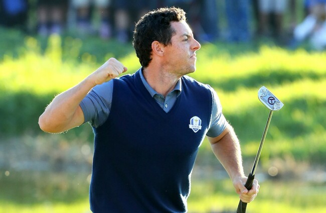 Rory McIlroy celebrates an eagle putt at the Ryder Cup.