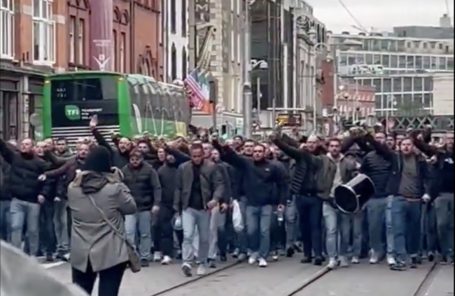 Footage of a large crowd of Schalke supporters marching along Abbey Street yesterday afternoon was shared online, with one female photographer capturing the scene.