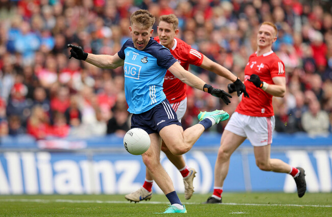 Bugler raised his first white flag of the day in the 12th minute, making it 0-2 a-piece. Jack McCaffrey found Cormac Costello, who laid it off to the on-rushing number 11. He barged by Peter Lynch and kicked off his left into the Canal End. His non-dominant foot, as pointed out by Eamonn Fitzmaurice on The Sunday Game.