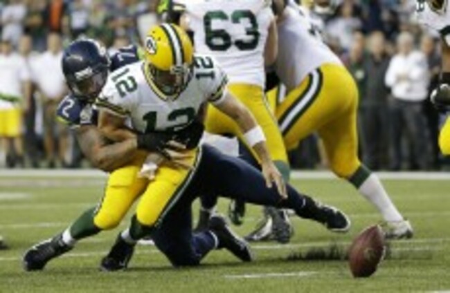Green Bay Packers quarterback Aaron Rodgers (12) fumbles after Seattle Seahawks' Michael Bennett knocked the ball loose. AP