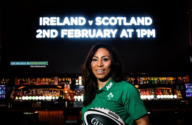 Fresh herself from a successful training weekend across the water in Wales, the Ireland centre is in flying form. Happy to be promoting another positive campaign for women’s rugby as Guinness call on pubs across the country to screen Ireland’s upcoming Six Nations games. Not so happy about the bloodshot eye she sustained in action against their Celtic cousins the day before.