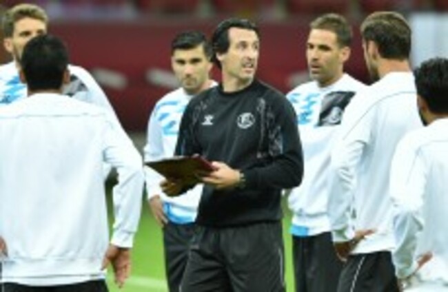Sevilla's head coach Unai Emery instructs players during a training session last night. AP/Press Association Images