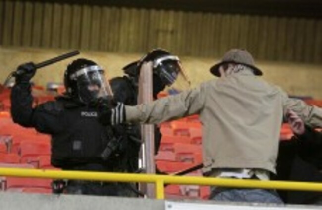 Approximately 30 supporters engaged directly with the police officers moments after they broke through safety barricades and tore up seats in the Upper North Stand.