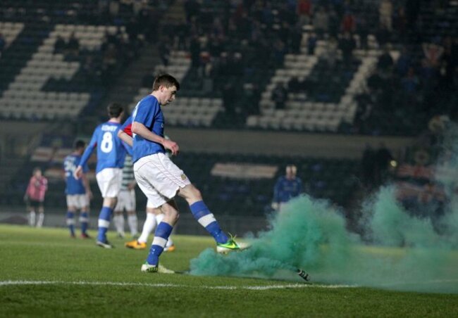 Linfield’s Billy Joe Burns kicks a flare from the pitch. (©INPHO/Presseye/Darren Kidd)