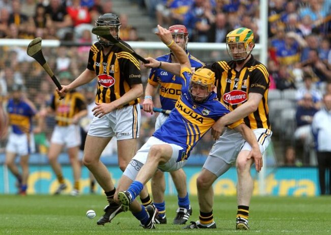 (Tipperary’s Shane McGrath tackled by Aidan Fogarty and Richie Power of Kilkenny – INPHO/Lorraine O’Sullivan)