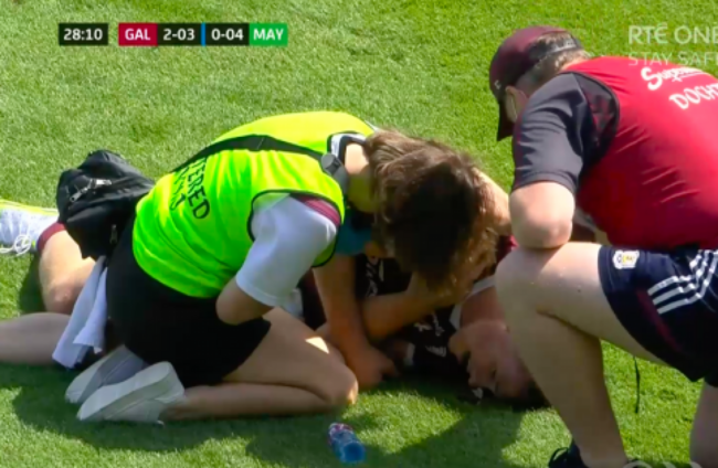 The Galway star lit up the first-half of the Connacht final and had 1-1 to his name in Croke Park before he was slammed to the ground by Mayo defender Padraig O’Hora in an off-the-ball incident.