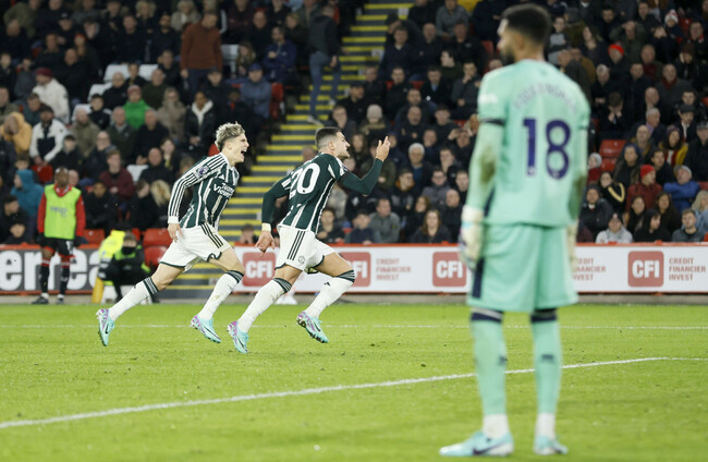 First Fernandes clipped the crossbar with a dipping free-kick before Rasmus Hojlund was denied by a fine save from Wes Foderingham, who rushed out and deflected the ball wide.