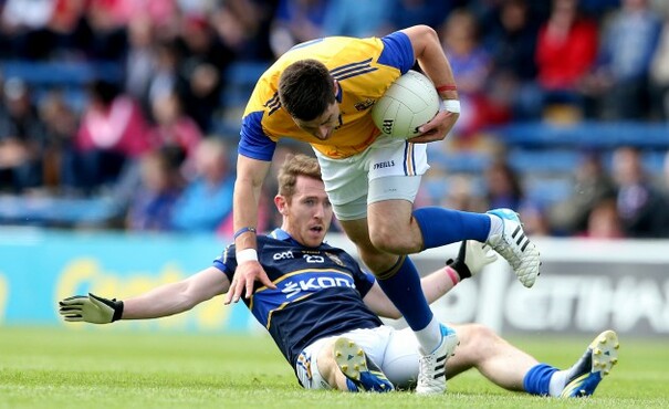 Darach Honan and Matthew O'Hanlon battle near the sideline in Ennis