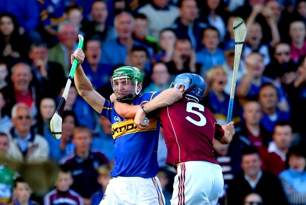 Noel McGrath and Johnny Coen fight it out for the ball in Thurles