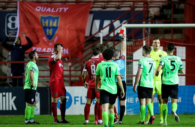 The controversial red card incident happened in the 76th minute when Shelbourne defender Luke Byrne was dismissed for a challenge on Alexander Kogler.