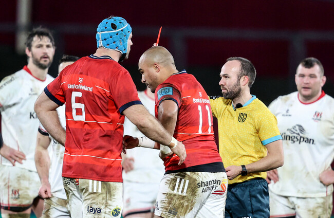 Munster down to 14 men against Ulster after Simon Zebo's red card - but only after referee Mike Adamson changes his mind after being talked around by the TMO. #RTERugby#RTESport#URC#MUNvULS