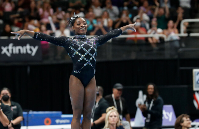 SIMONE BILES DAZZLED on floor exercise on the way to a record eighth all-around title at the US Gymnastics Championships, another step on a comeback trail pointing toward the Paris Olympics.