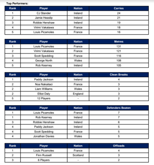 Ireland’s backs also featured prominently in the defenders beaten category with fullback Rob Kearney tied atop the leaderboard with Picamoles on seven.