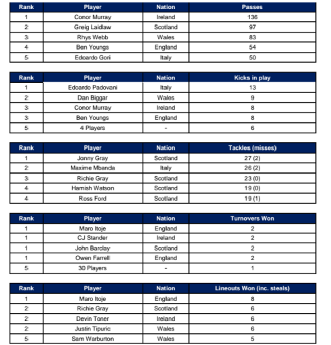 IRELAND AREN’T SITTING pretty on the one table that counts but a number of Joe Schmidt’s players recorded impressive numbers on the opening weekend of Six Nations action in 2017.