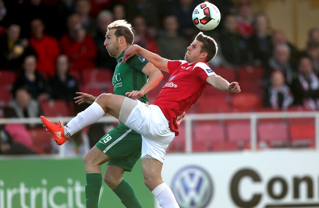 Kyle Callan-McFadden of Sligo Rovers attempts from block a cross from Cork City's Kevin O'Connor. Bryan Keane / INPHO