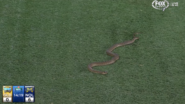 In the NRL match between Gold Coast Titans and North Queensland Cowboys this morning, a poisonous snake slithered onto the sidelines sending fans scurrying for safety.