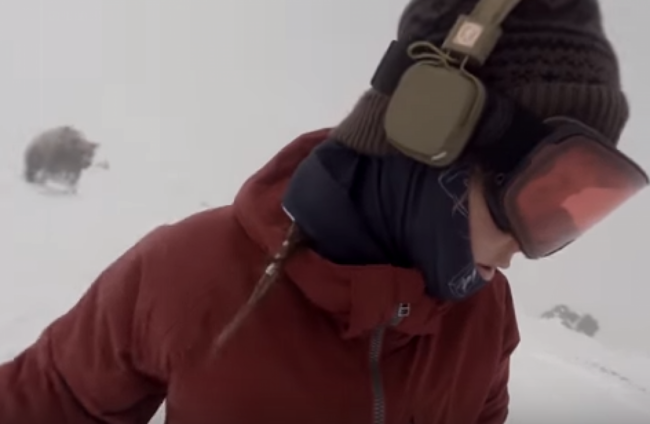 The terrifying moment a snowboarder is unknowingly chased down the slope by a bear