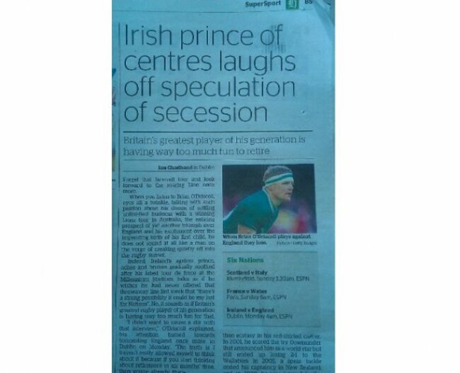 So, a newspaper in New Zealand reckons Brian O'Driscoll is 'Britain's greatest' rugby star