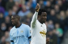 Wilfried Bony has just scored Swansea's first ever goal at the Ethiad Stadium