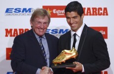 Kenny Dalglish travels to Barcelona to present Suarez with European Golden Shoe