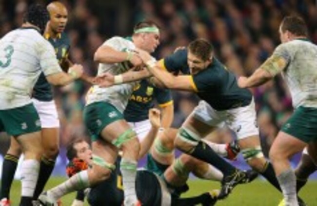 Paul O'Connell and Robbie Henshaw combine to win possession from Marcel Coetzee. Cathal Noonan / INPHO