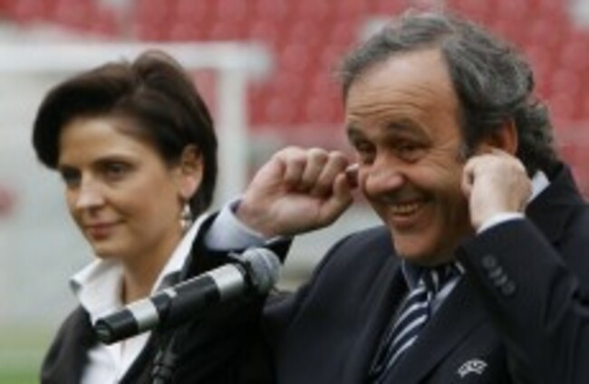 Polish Sport Minister Joanna Mucha and UEFA President Michel Platini during a press conference at the National Stadium in Warsaw. (AP Photo/Czarek Sokolowski)