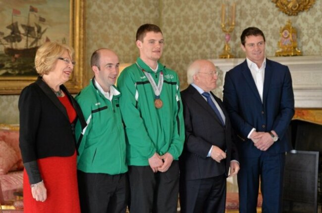 Michael D Higgins and his wife, Sabina, greet the Special Olympians and David Wallace.