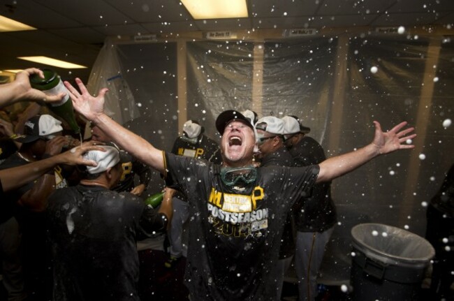 Pittsburgh Pirates first base coach Rick Sofield celebrates in the locker room after the Pirates clinched a playoff spot.