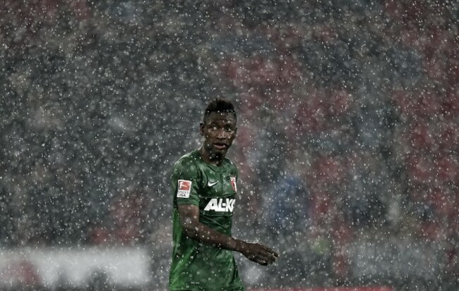 Augsburg’s Abdul Rahman Baba leaves the pitch after the match was interrupted because of heavy rain and lightning
