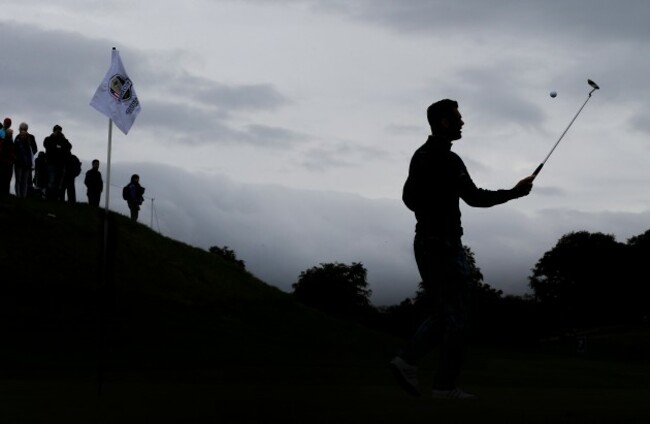 Miguel Angel Jimenez smokes as he watches the action at a Ryder Cup practise session